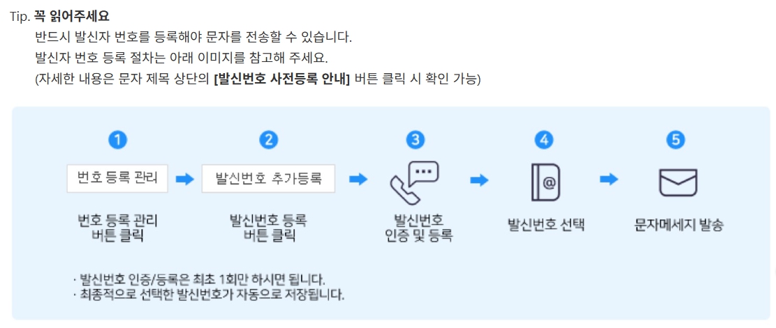 - 발신번호 등록 후 사용 가능